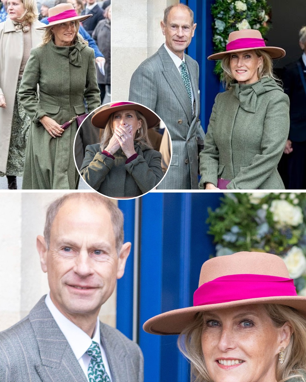Sophie donned a full-length green tweed coat, tan boots and wide-brimmed hat with pink ribbon