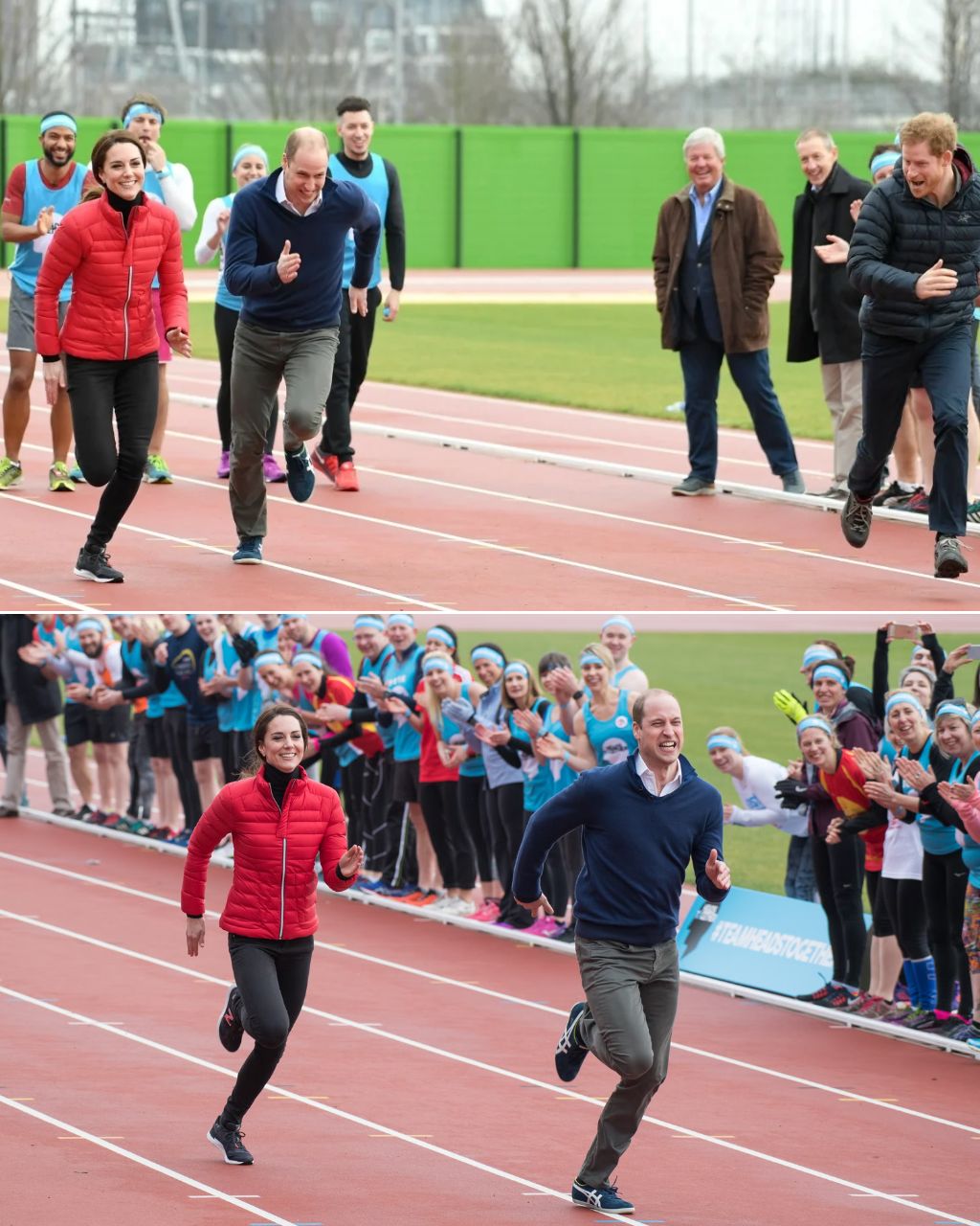 Kate Middleton, ever graceful yet energetic, wore a sleek white tank top and royal blue leggings, while Prince William sported a light navy tee and shorts — and from the moment they stepped onto the track, you could feel the energy change.
