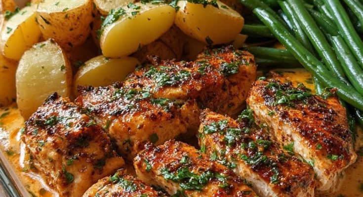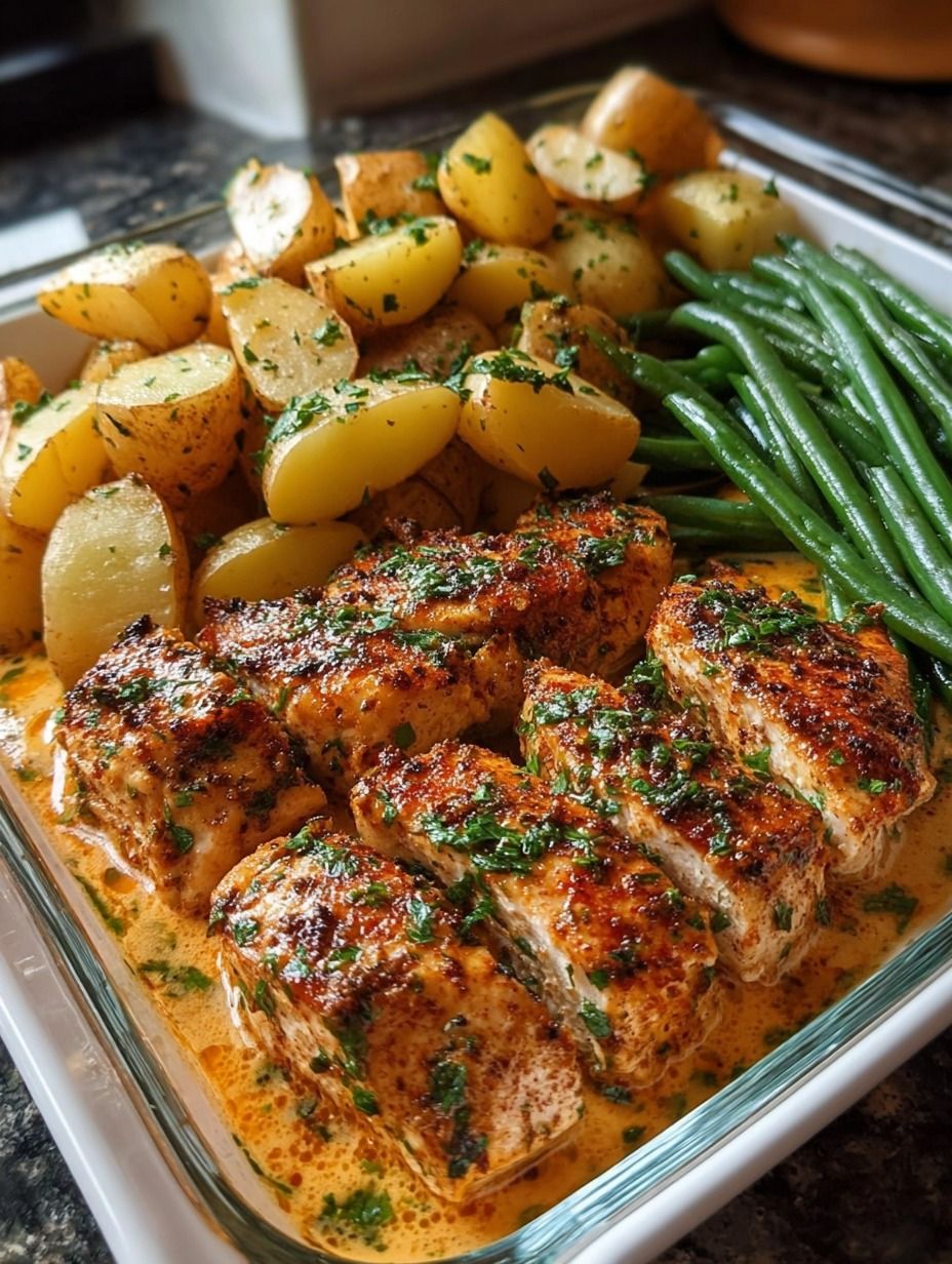 Garlic Butter Chicken with Roasted Potatoes and Green Beans is cozy, simple, and deeply satisfying — the kind of dinner that feels like a warm hug after a long day. The garlic sizzles in butter, the potatoes turn golden and crisp around the edges, and the chicken stays juicy and tender. It’s hearty without being heavy, comforting without being complicated.